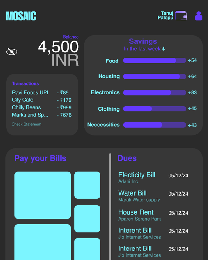 The design of the fictional brand Mosaic is centered around simplicity and ease of use, making financial management feel effortless. With a clean, minimalist aesthetic, the interface is designed to be intuitive and accessible to all. Calming colors and clear visuals guide users through budgeting and financial planning without overwhelming them. Every element is crafted to remove complexity, making the experience approachable for a broad audience. Mosaic’s design emphasizes clarity and peace of mind, allowing users to focus on their goals while we take care of the details.